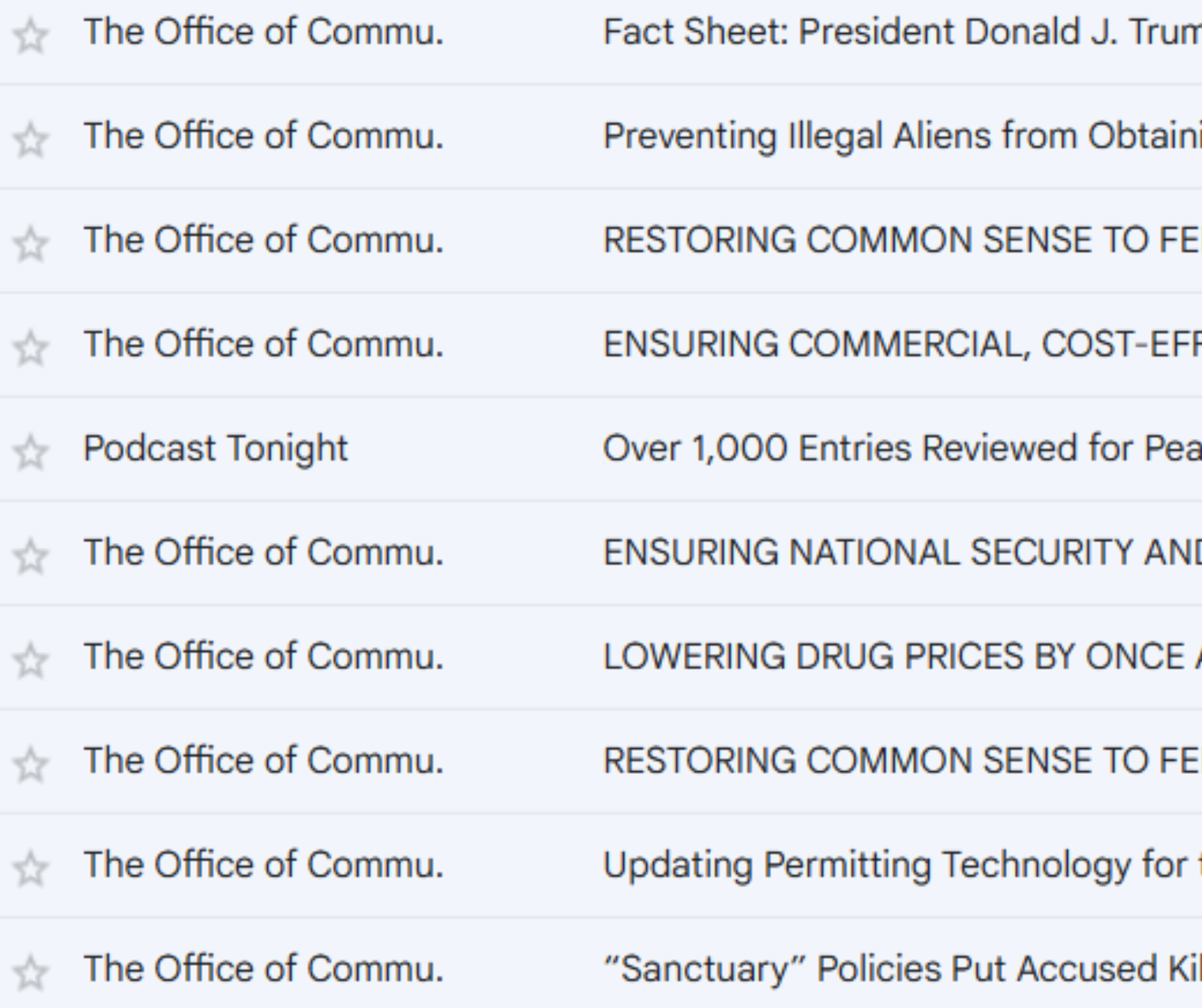 Emails about executive orders were typed in a thin, very official looking font oftentimes putting words and subject lines in capital letters like “RESTORING COMMON SENSE TO FEDERAL PROCUREMENT” which announced the roll back of regulations on the federal government’s purchases. However the formal press releases like ““Sanctuary” Policies Put Accused Killer Back on the Streets” is written in a more common newsletter style akin to something that would be made in MailChimp.